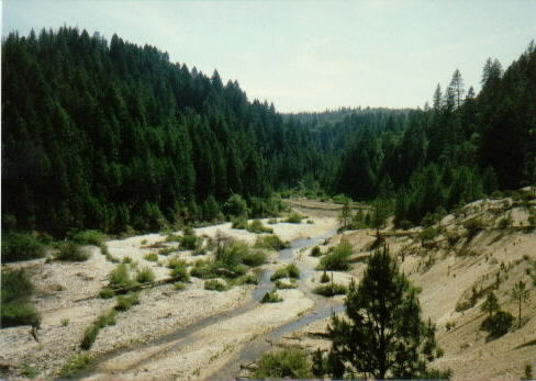 This stream was not more than a hundred feet wide, but was about twenty feet deep, and the current was very swift. We felled a large pine tree across it, but the center swayed down so that the water ran over it about a foot deep. We tied ropes together and stretched them across to make a kind of hand railing, and succeeded in carrying over all out things. We undertook to make our horses swim the creek, and finally forced two of them into the stream, but as soon as they struck the current they were carried down faster than we could run. One of them at last reached the bank and got ashore, but the other went down under the tree we had cut, .... He finally struck a drift about a hundred yards below, and we succeeded in getting him out almost drowned.